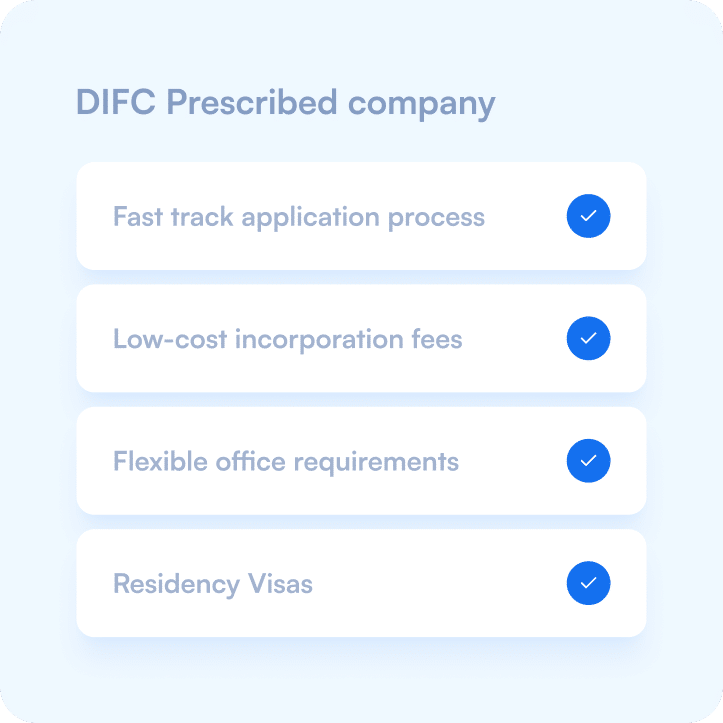 Founders of a DIFC prescribed company benefit from significant cost saving by using the registered office address of a corporate service provider, rather than having to rent physical office space. Passports can be digitally certified on the DIFC platform at no cost to founders. Licensing fees are cheaper than most options in the region and post-incorporation filings carry minimal or no regulator fees.